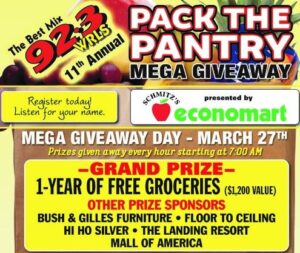 Listen for our "Pack the Pantry" sounder, be the 6th caller and you are qualified to win or register at area business and listen for us to call your name to also qualify.